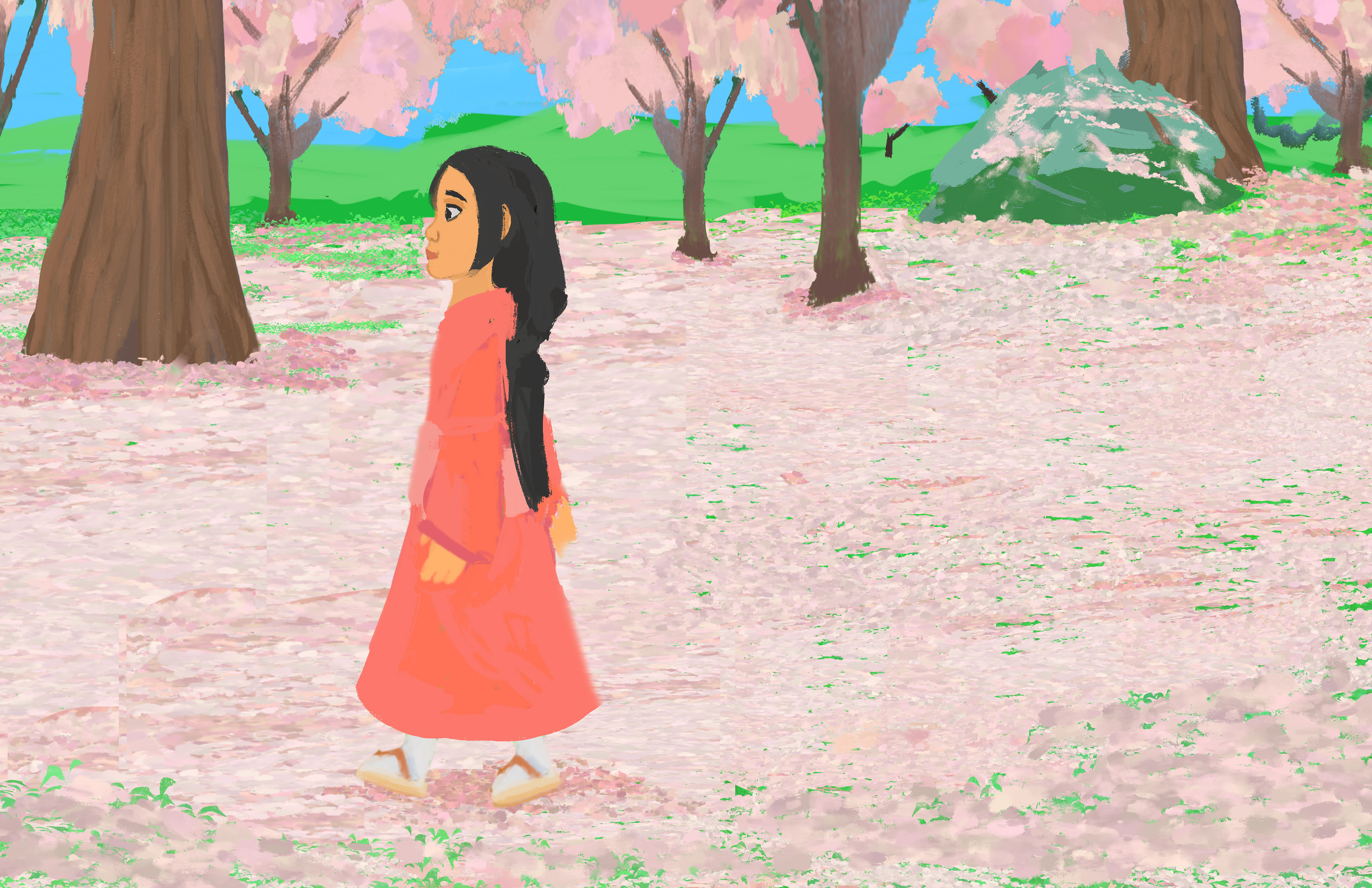 The girl strolled beneath the cherry blossom trees on her way toward the woods.